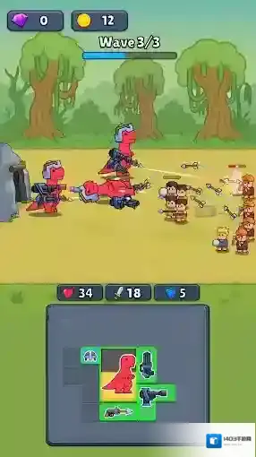 1、在网格上排列你的恐龙和武器,将它们正确排列,并聚集你不可阻挡的恐龙军队,还能装备上武器,去消灭出现的敌人。